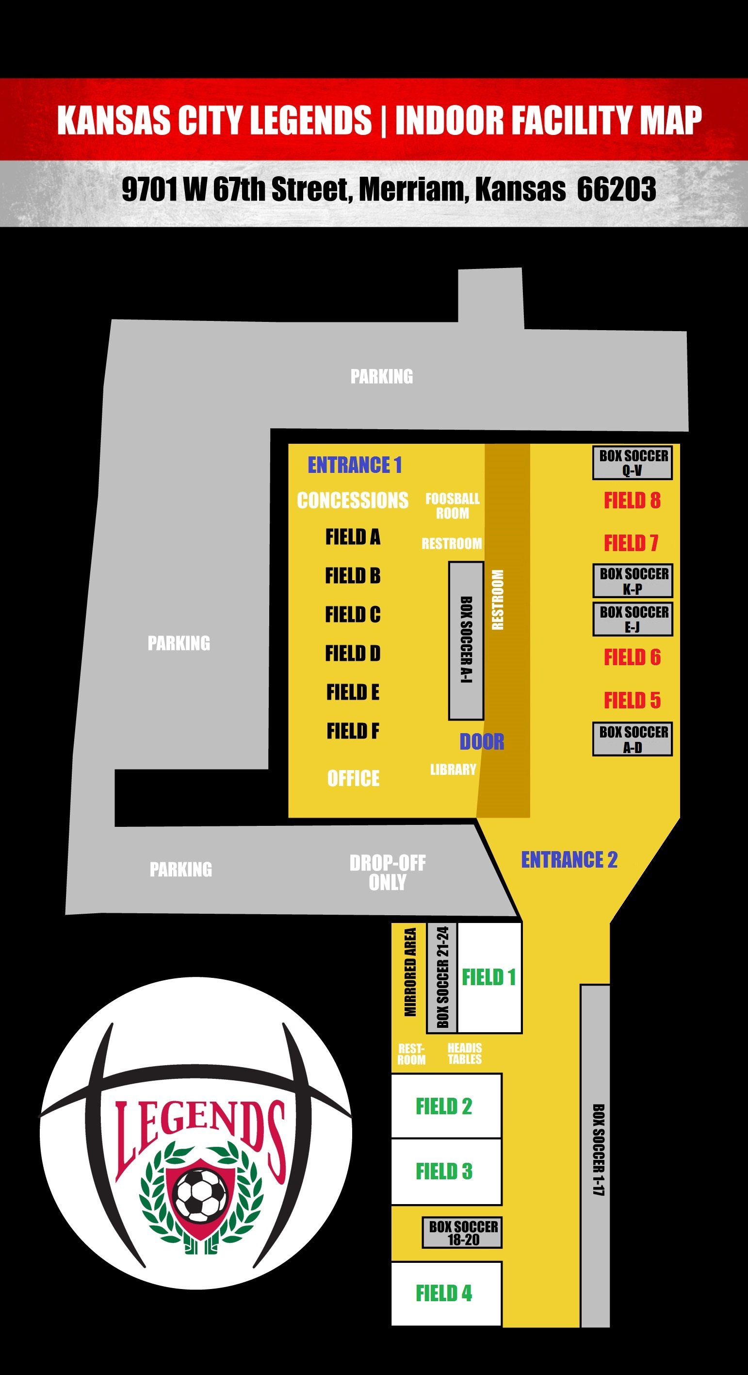 KC Legends Indoor Training Facility (Facility): 9701 West 67th Street, Merriam, KS 66203